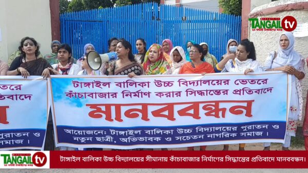 টাঙ্গাইলে বিদ্যালয়ের সীমানার ভেতরে কাঁচাবাজার নির্মাণ করার সিদ্ধান্তের প্রতিবাদে মানববন্ধন
